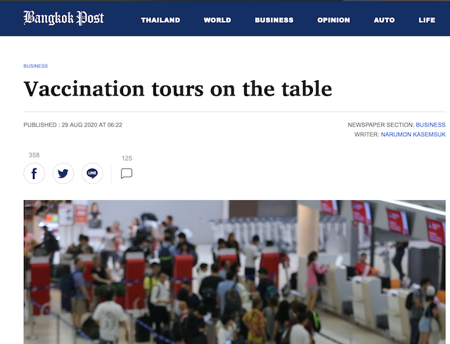 “โดยส่วนตัวมองว่า ทางเลือกที่น่าสนใจที่สุดคือ ประเทศเยอรมันนี และอังกฤษ ซึ่งมีมาตรฐานสูง เป็นที่ยอมรับ และยังมีเที่ยวบินเชิงพานิชย์จากไทย บินไปทุกอาทิตย์ ตามปกติ แต่ยังไม่มีการประกาศฉีดแก่สาธารณะ และยังไม่มีความชัดเจนเรื่องโควต้าในการฉีด ว่าจะมีสัดส่วนเท่าไหร่อย่างไร ซึ่งบริษัทของเราและพาร์ทเนอร์ ได้ติดตามข่าวสารและประสานงานอย่างใกล้ชิด หากมีความคืบหน้า จะแจ้งต่อไป และจะประสานกับทางราชการไทย เพื่อความแน่ชัดอีกครั้ง ว่าสามารถจัดได้หรือไม่”