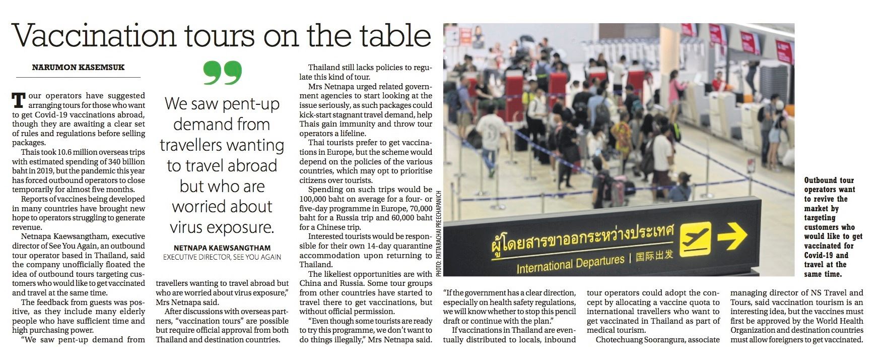 Netnapa Kaewsangtham, executive director of See You Again, an outbound tour operator based in Thailand, said the company unofficially floated the idea of outbound tours targeting customers who would like to get vaccinated and travel at the same time.