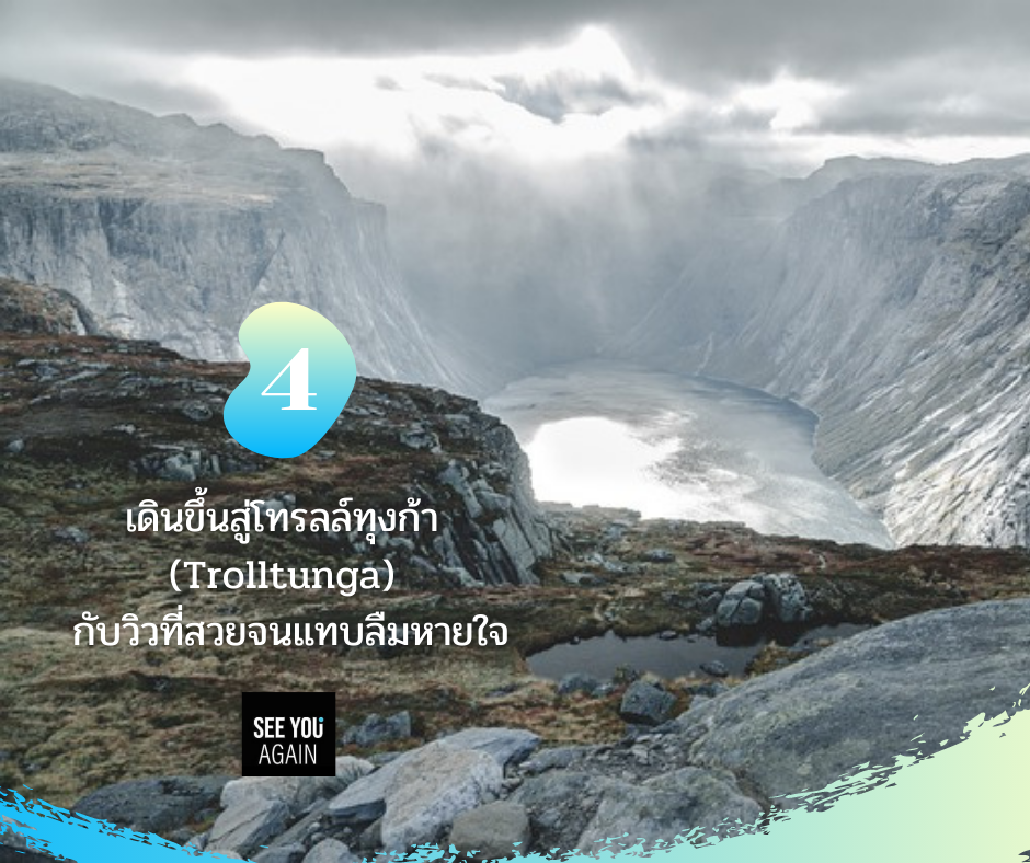 4ด้วยเป็นหนึ่งในหน้าผาที่โดดเด่นที่สุดของนอร์เวย์ โทรลล์ทุงกา หรือที่แปลว่า “ลิ้นของโทรลล์” จึงกลายเป็นจุดที่นักท่องเที่ยวสายแอดเวนเจอร์ อยากขึ้นไปยืนโพสต์ท่าตรงชะง่อนผา ที่ยื่นออกไปที่ความสูงกว่า 700 เมตร มองออกไปเบื้องหน้า เป็นเวิ้งทะเลสาบและเทือกเขาทอดทิวสุดอลังการ