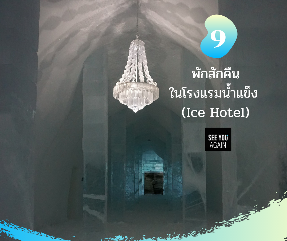 9 ประสบการณ์ท่องเที่ยวในฤดูหนาวที่เติมความฟินอีกระดับ คือการเช็คอินพักค้างคืนในโรงแรมน้ำแข็ง ที่พรั่งพร้อมด้วยเตียง โต๊ะ เก้าอี้ แชนเดอเลียร์ เพียงแต่ทั้งหมดเป็นน้ำแข็ง! ยามนอนจะมีถุงนอน ปูบนขนสัตว์หนานุ่มที่ใช้รองเตียงน้ำแข็ง รับรองว่าเป็นประสบการณ์ที่จดจำไปแสนนาน