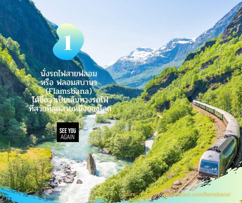 1 นั่งรถไฟสายฟลอม หรือฟลอมสบานา (Flamsbana) ได้ชื่อว่าเป็นเส้นทางรถไฟที่สวยที่สุดสายหนึ่งของโลก