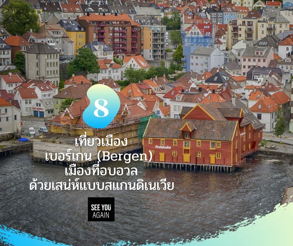 8 เมืองเบอร์เกน คงอยู่ในลิสต์ของเมืองน่าเยือนเสมอสำหรับนอร์เวย์ ด้วยลักษณะเมืองล้อมรอบด้วยภูเขาถึง 7 ลูก มีทิวทัศน์และบรรยากาศของเมืองท่าอย่างดั้งเดิมด้วยอาคารไม้หลังสีแดง และสีเหลืองมัสตาร์ดไม่เพี้ยนจากโปสการ์ด ถ้าออกมาเดินเล่นในยามเช้า จะได้เห็นตลาดอาหารทะเลที่คึกคัก สามารถเลือกซื้อและให้ร้านปรุงให้ได้เลย