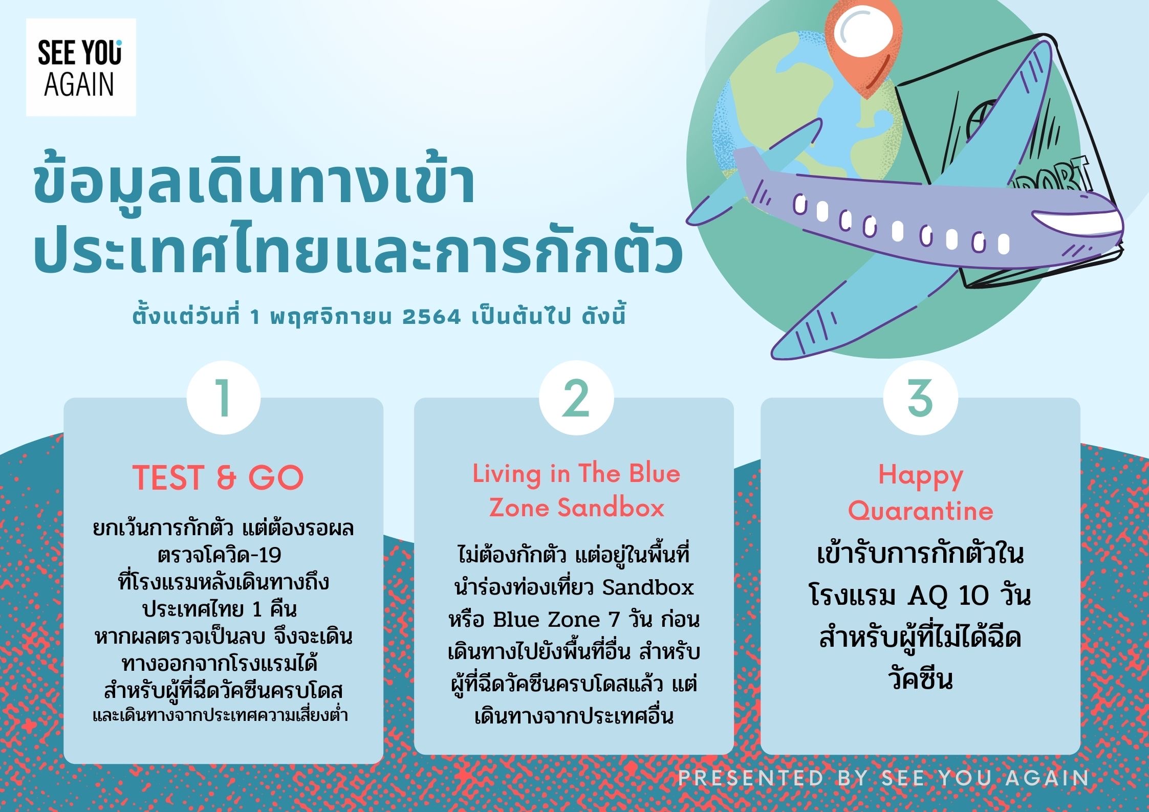 รูปแบบการเดินทางเข้าประเทศไทยตามแผนการเปิดประเทศของรัฐบาล ตั้งแต่วันที่ 1 พฤศจิกายน 2564 เป็นต้นไป ดังนี้