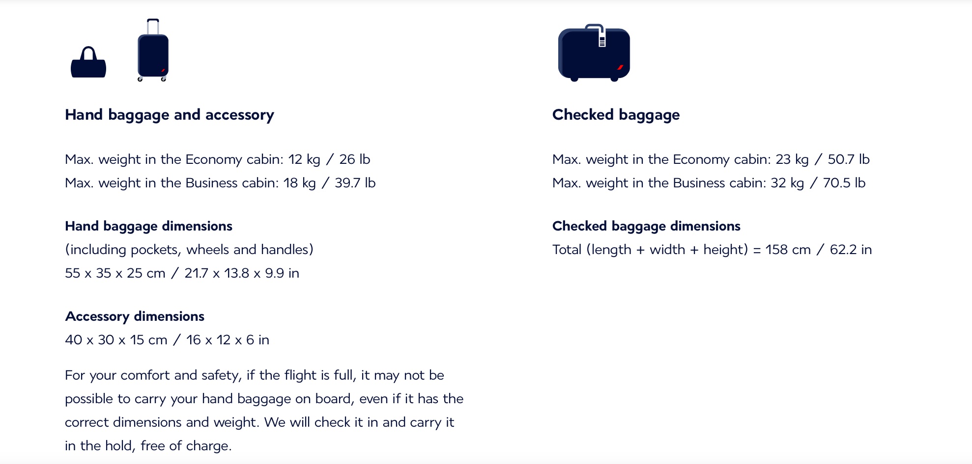 เพื่อความสะดวกสบายและความปลอดภัยของคุณ หากเที่ยวบินเต็ม คุณอาจไม่สามารถพกพากระเป๋าถือขึ้นเครื่องได้ แม้ว่าจะมีขนาดและน้ำหนักที่ถูกต้องก็ตาม เราจะทำการเช็คอินและพกพาติดตัวไปโดยไม่เสียค่าใช้จ่าย