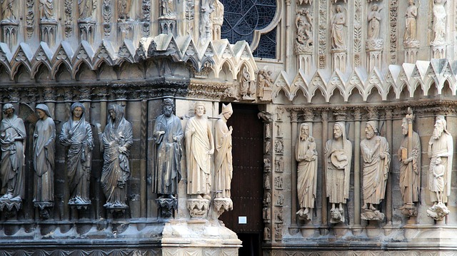 ด้านหน้าอาคารมีภาพนูนสวยงาม รวมทั้ง Portail de la Vierge (Doorway of the Virgin) ที่สร้างขึ้นในปี 1240