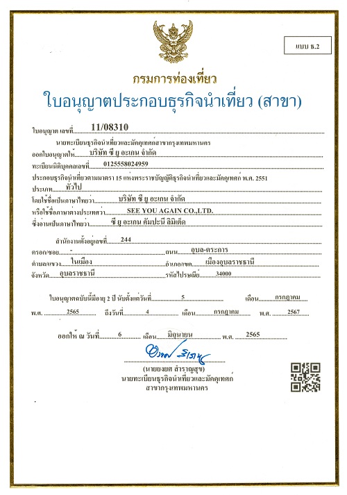 ใบอนุญาตประกอบธุรกิจนำเที่ยว บริษัทซี ยู อะเกน จำกัด เลขที่ 11/08310