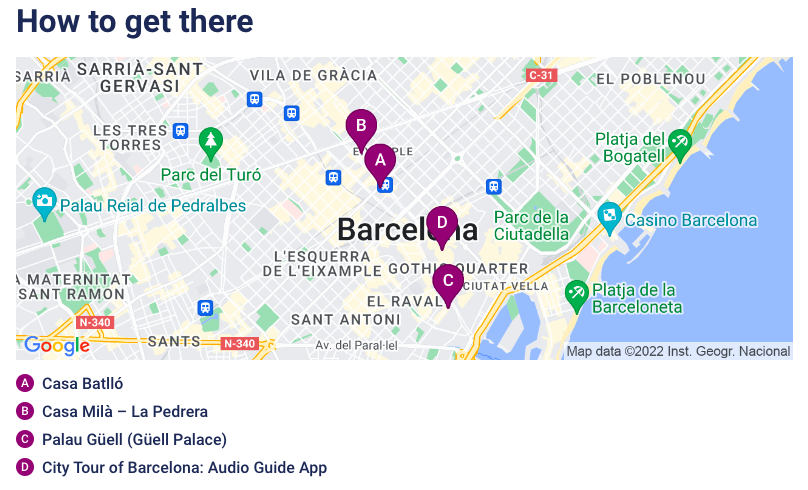 ฟังเสียงบรรยายในขณะที่ท่องเที่ยวตามสถานที่ต่างๆในบาร์เซโลนา รวมทั้ง Park Guell, Sagrada Familia, Casa Mila, Casa Batllo และอีกมากมาย เสียงบรรยายไกด์ของบาร์เซโลนานี้จะช่วยนำทางคุณไปกว่า 100 จุดที่น่าสนใจ ในแต่ละที่ ตั้งแต่ La Rambla จนไปถึง Park Guell และ Camp Nou ซึ่งคุณจะได้ยินเสียงบรรยายของสถานที่ต่างๆจากผู้เชี่ยวชาญในท้องถิ่นกว่าสองนาที