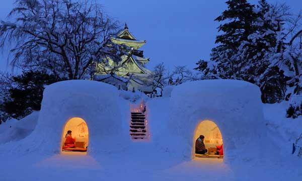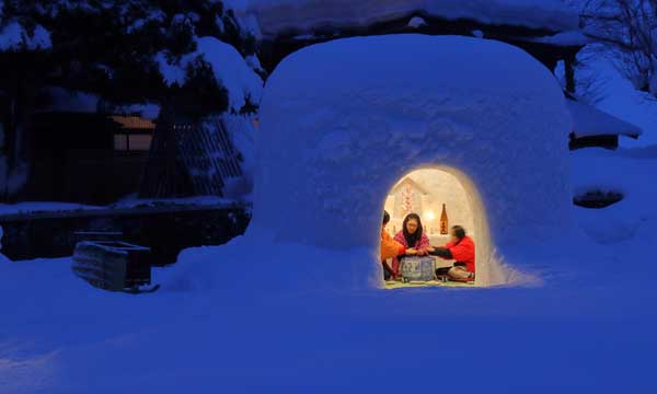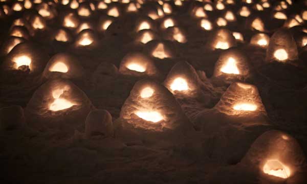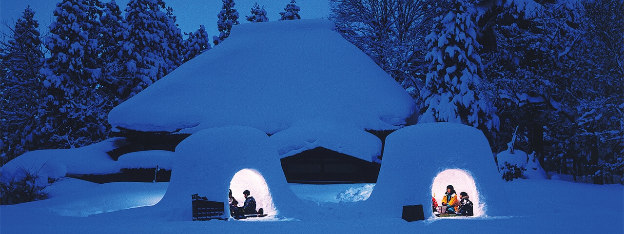 คามาคุระ กระท่อมหิมะส่องประกายด้วยแสงสีส้ม เกิดเป็นดวงไฟส่องสว่างไปทั่วทุ่งหิมะ ด้านในนั้น จะมีเหล่าเด็กที่สวมชุดพื้นเมืองคอยบอกท่านว่า “ไฮอิตเตะ ทันเซ (โปรดเข้มาเลย)” เมื่อท่านเข้าไปในคามาคุระ ท่านจะต้องให้ของถวายกับแท่นบูชาที่เทพเจ้าแห่งน้ำชินโตประทับอยู่เป็นสิ่งแรก เด็กๆ จะเสริ์ฟอามะซาเกและยากิโมจิ (เค้กข้าวย่าง) ท่าน ท่านสามารถใช้เวลากับเหล่าเด็กๆ ขณะที่อุ่นมือของท่านกับถ้วยเตาถ่านฮิบาชิ ช่วงเวลาที่ราวกับหลุดออกมาจากหน้าหนังสือเรื่องเล่าเก่าแก่ ผู้คนจะเริ่มสร้างคามาคุระในช่วงปลายเดือนมกราคม ช่วงต้นเดือนกุมภาพันธ์ ท่านสามารถไปเยี่ยมชมกระบวนการสร้างคามาคุระได้