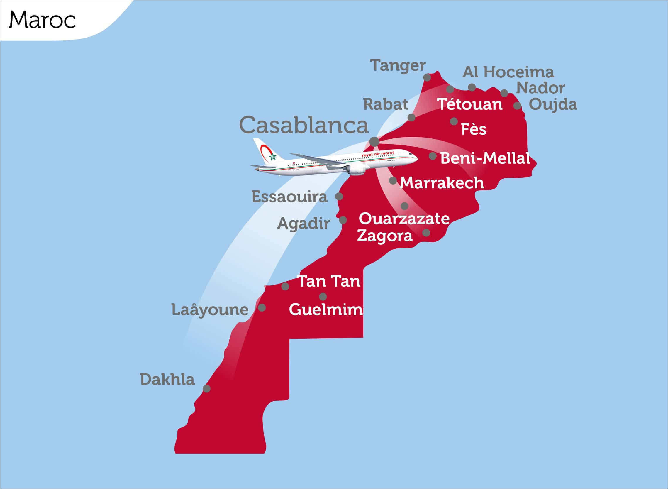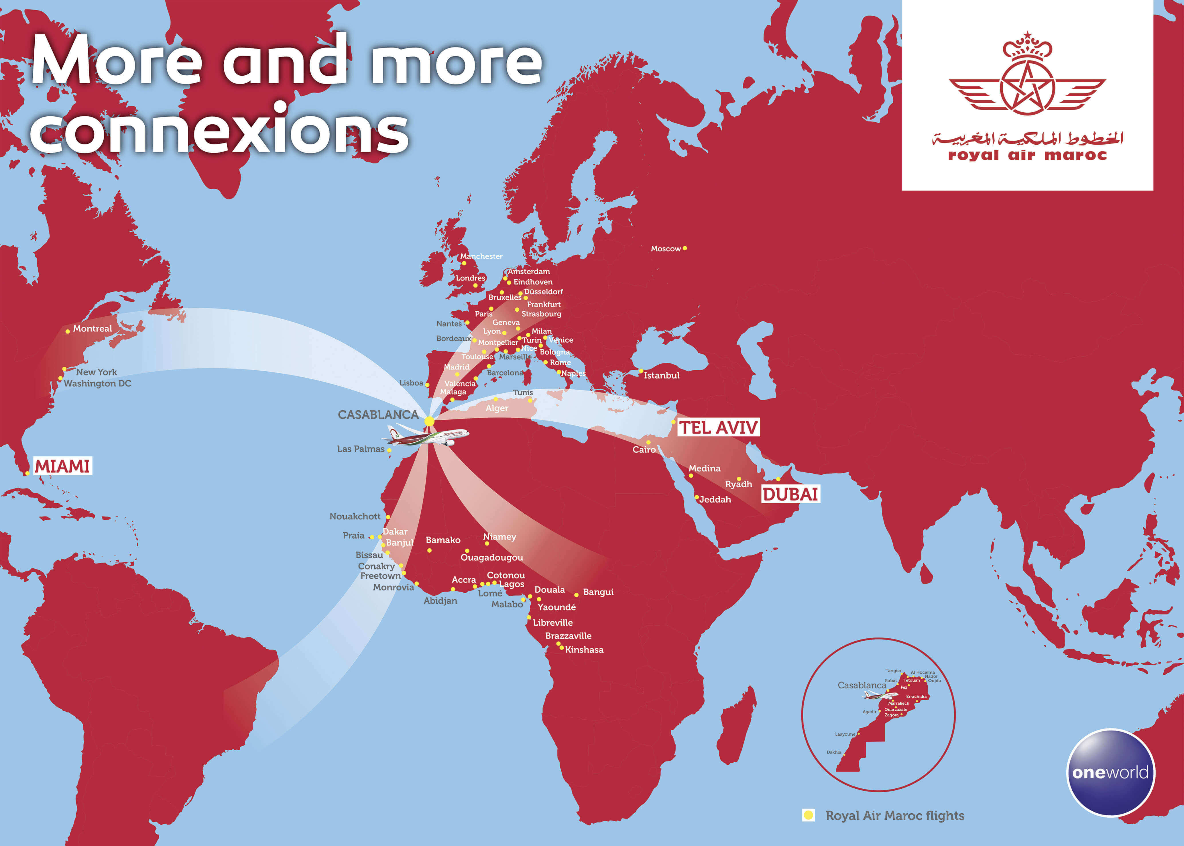 Royal Air Maroc บริการเที่ยวบินระหว่างประเทศ จากโมร็อกโก สู่ 41 เมืองในยุโรป, 29 เมืองในแอฟริกา, 7 เมืองในเอเซีย, 7 เมืองในอเมริกาเหนือ และอเมริกาใต้