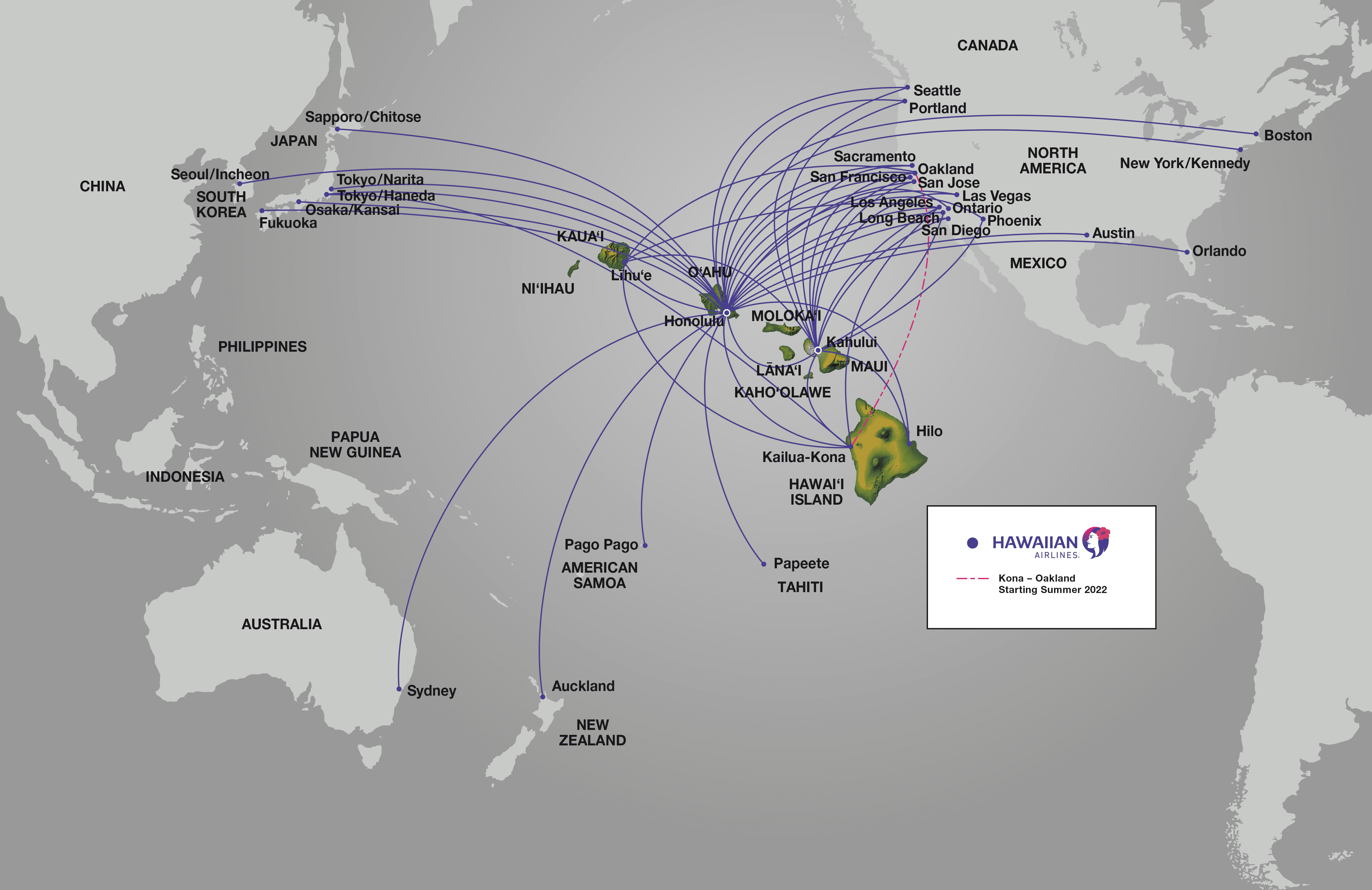 Hawaiian Airlines ยังให้บริการเที่ยวบินแบบ non-stop ระหว่าง โฮโนลูลู, ฮาวาย และ ประเทศในเอเชีย และแปซิฟิก