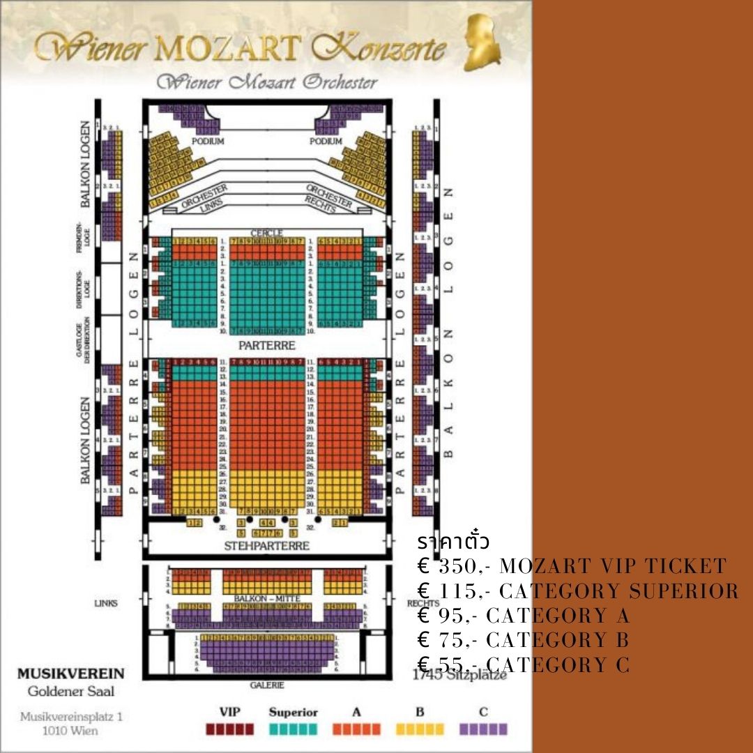 คอนเสิร์ต MOZART เวียนนาเป็นตัวแทนของหนึ่งในไฮไลท์ของงานดนตรีเวียนนา และเป็นส่วนสำคัญของชีวิตทางวัฒนธรรมและศิลปะของเมืองหลวงของออสเตรีย คอนเสิร์ตจัดขึ้นที่ Golden Hall of the Musikverein, Brahms Hall และใน Vienna State Opera ซึ่งเป็นโรงแสดงคอนเสิร์ตที่ใหญ่ที่สุดและมีชื่อเสียงที่สุดของเวียนนา
