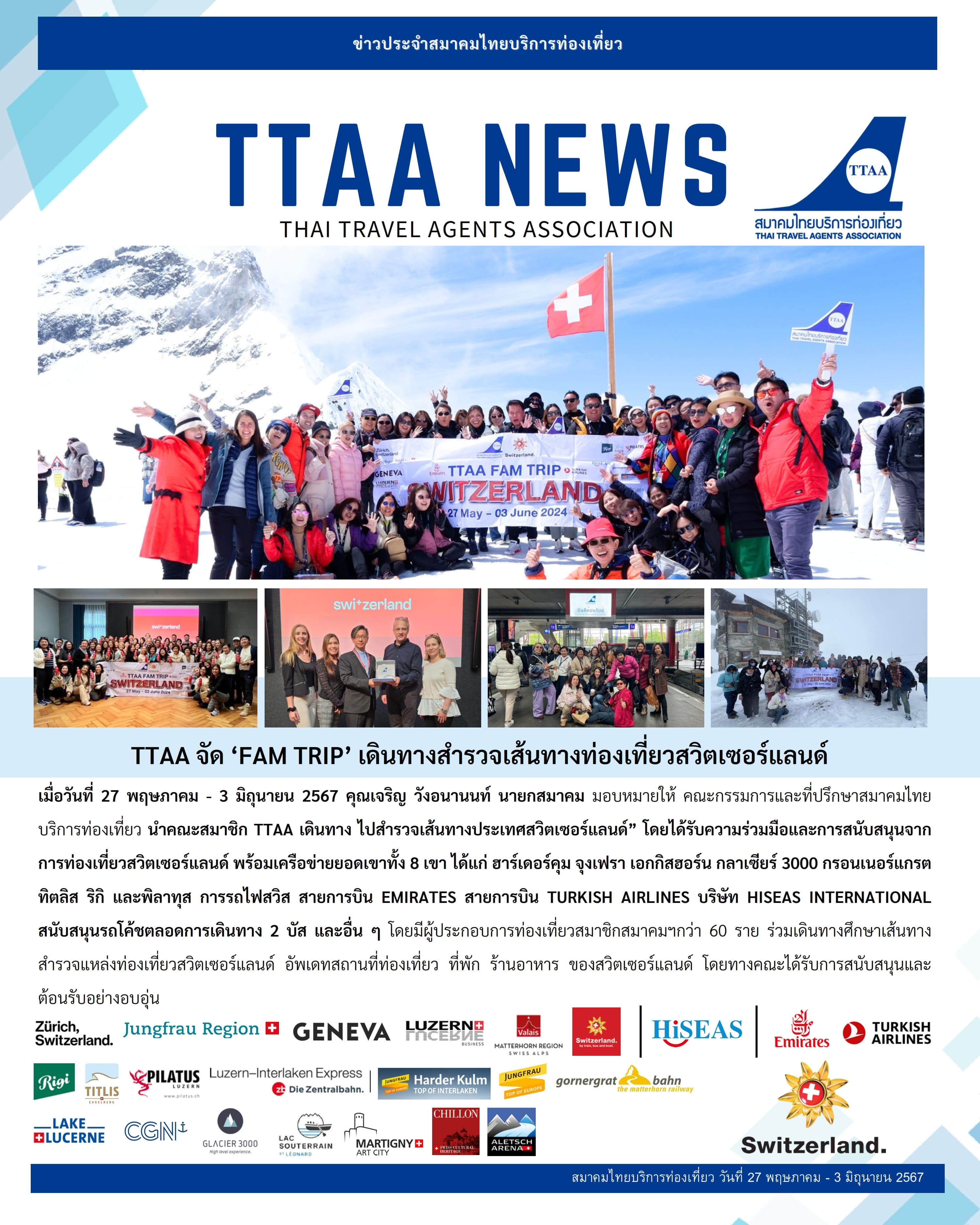 เมื่อวันที่ 27 พฤษภาคม - 3 มิถุนายน 2567 คุณเจริญ วังอนานนท์ นายกสมาคม มอบหมายให้ คณะกรรมการและที่ปรึกษาสมาคมไทยบริการท่องเที่ยว นำคณะสมาชิก TTAA เดินทาง ไปสำรวจเส้นทางประเทศสวิตเซอร์แลนด์” โดยได้รับความร่วมมือและการสนับสนุนจากการท่องเที่ยวสวิตเซอร์แลนด์ พร้อมเครือข่ายยอดเขาทั้ง 8 เขา ได้แก่ ฮาร์เดอร์คุม จุงเฟรา เอกกิสฮอร์น กลาเซียร์ 3000 กรอนเนอร์แกรต ทิตลิส ริกิ และพิลาทุส การรถไฟสวิส สายการบิน Emirates สายการบิน Turkish Airlines บริษัท Hiseas International สนับสนุนรถโค้ชตลอดการเดินทาง 2 บัส และอื่น ๆ โดยมีผู้ประกอบการท่องเที่ยวสมาชิกสมาคมฯกว่า 60 ราย ร่วมเดินทางศึกษาเส้นทางสำรวจแหล่งท่องเที่ยวสวิตเซอร์แลนด์ อัพเดทสถานที่ท่องเที่ยว ที่พัก ร้านอาหาร ของสวิตเซอร์แลนด์ โดยทางคณะได้รับการสนับสนุนและต้อนรับอย่างอบอุ่น