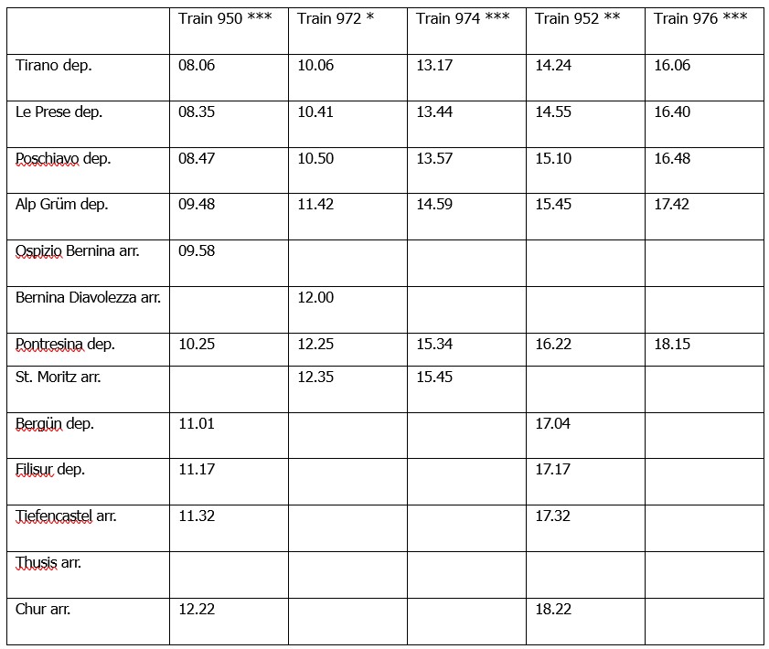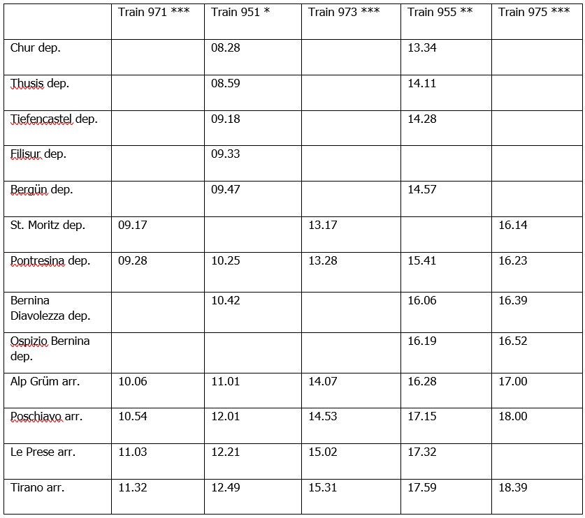 Bernina Express เป็นรถไฟที่เชื่อมต่อ Chur (หรือ Davos) ในสวิตเซอร์แลนด์ไปยัง Poschiavo ในสวิตเซอร์แลนด์และ Tirano ในอิตาลี