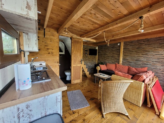 ตัวบ้านชั้นล่างจะเป็นห้องนั่งเล่น ห้องน้ำ มีเคาน์เตอร์ครัว มีตู้เย็น มีเครื่องครัวต่างๆ ที่สามารถทำอาหารได้