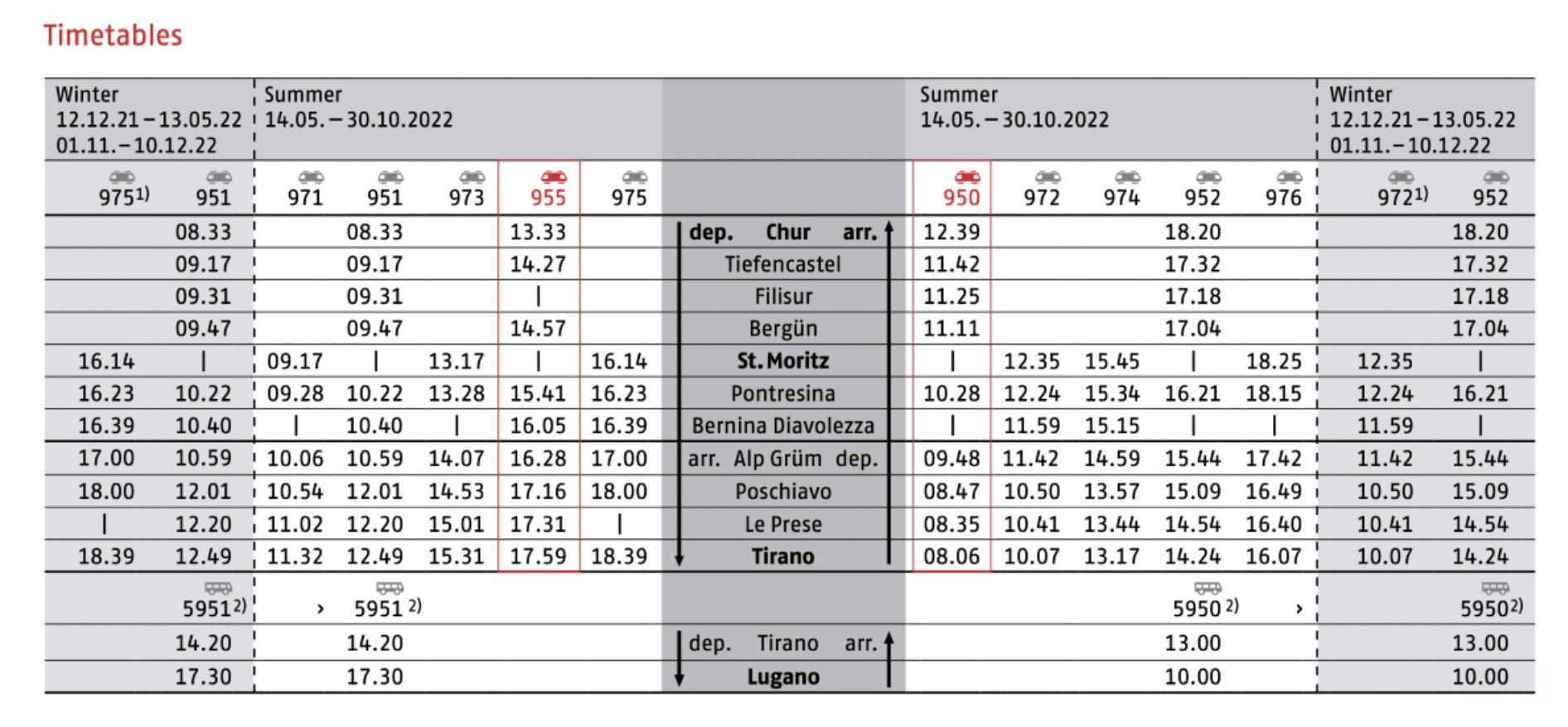 ช่วงเวลาการเดินทาง: ในช่วงฤดูร้อน (มิถุนายน-กันยายน) Bernina Express จะมีบริการรถไฟพิเศษที่หยุดน้อยลงเพื่อการเดินทางที่รวดเร็วขึ้น ในช่วงฤดูอื่น ๆ รถไฟจะเป็นส่วนหนึ่งของบริการรถไฟประจำภูมิภาค