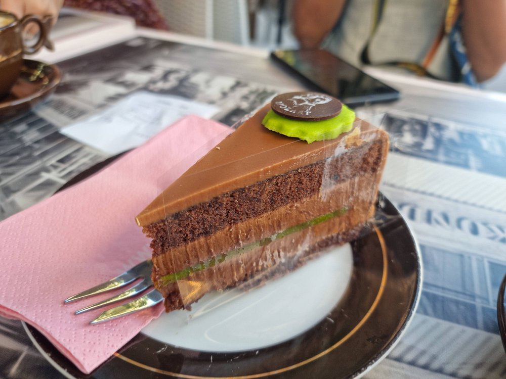 - Sachertorte เค้กช็อกโกแลตเนื้อแน่น มีแยมแอปริคอทตรงกลางและเคลือบช็อกโกแลตเนียนละเอียด เสิร์ฟพร้อมวิปครีม
