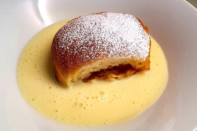 8. Buchteln ขนมปังก้อนเนื้อนุ่ม สอดไส้แยมผลไม้ต่างๆ เช่น แยมแอปริคอต เสิร์ฟอุ่นๆ พร้อมซอสวานิลลา