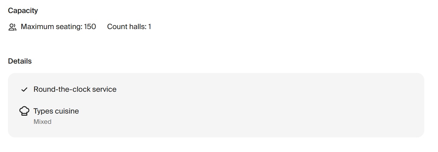 พื้นที่ของคลับเน้นความใกล้ชิด ที่นั่งจัดวางแบบกระชับ ทำให้ผู้ชมรู้สึกมีส่วนร่วมกับการแสดง อาหารและเครื่องดื่มเป็นสไตล์ Finger Food รับประทานง่าย ค่าใช้จ่ายเฉลี่ยอยู่ที่ประมาณ 1,500 รูเบิล เหมาะสำหรับการออกมาสังสรรค์กับเพื่อนในยามค่ำคืน