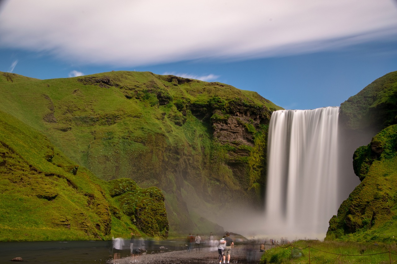 จากนั้นเดินทางต่อไปยังน้ำตกยิ่งใหญ่ Skogafoss สายน้ำขนาดมหึมาไหลตกจากหน้าผาสูงกว่า 60 เมตร ม่านน้ำสีขาวกระทบพื้นเบื้องล่างจนเกิดละอองน้ำลอยฟุ้ง