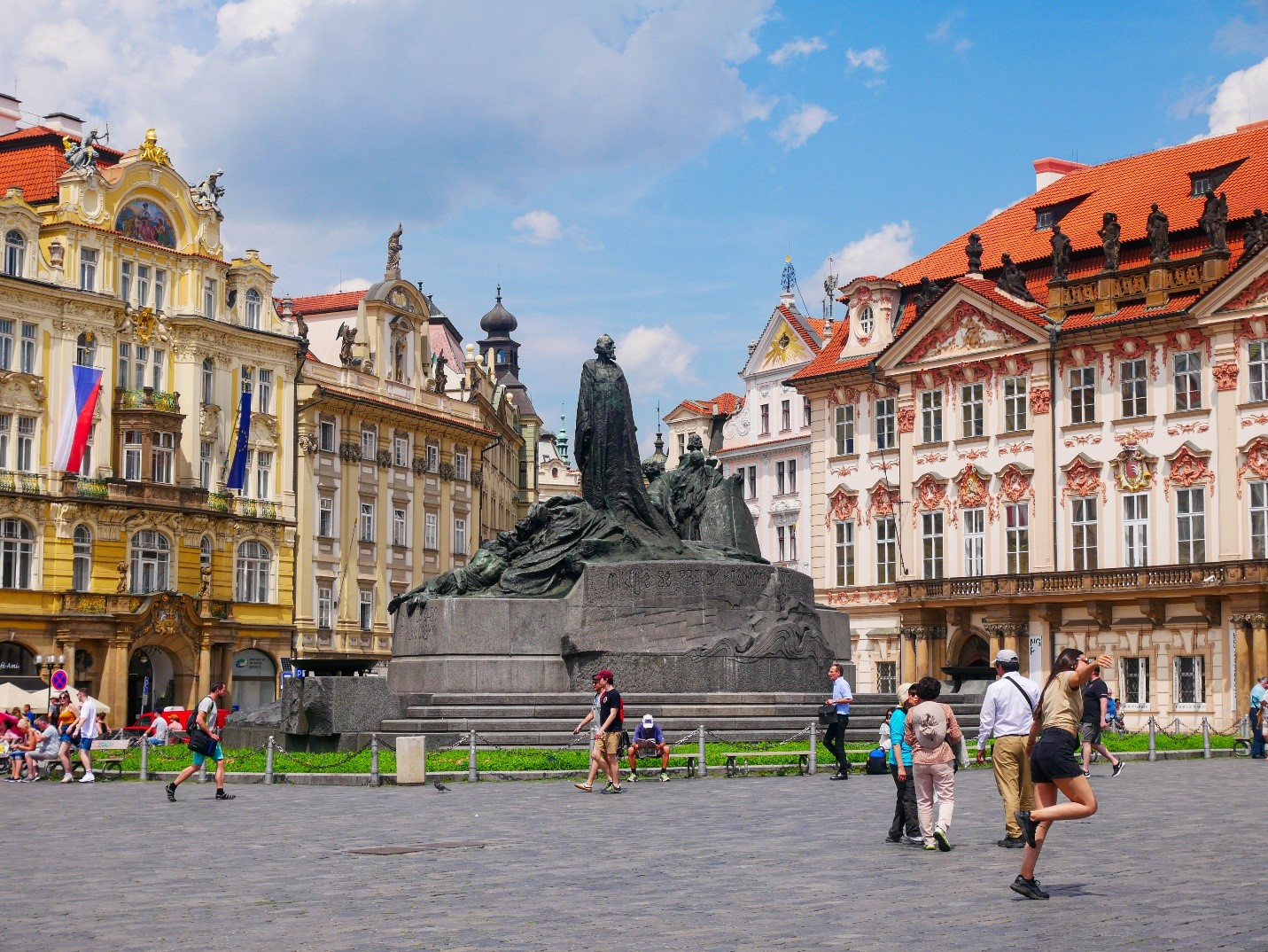 เราจะสังเกตเห็นรูปปั้นของชายคนหนึ่งยืนอยู่บริเวณใจกลางของจัตุรัส เขาคนนั้นคือ ยาน ฮุส (Jan Hus) เป็นนักปฏิรูปคริสตจักรของเช็กซึ่งฝักใฝ่นิกายโปรเตสแตนท์ซึ่งตอนท้ายเขาถูกกล่าวหาว่าเป็นคนนอกรีตจากนิกายโรมันคาทอลิค โดยในปี ค. ศ. 1415 คำสอนที่ลึกซึ้งของเขามีอิทธิพลต่อคนเป็นจำนวนมาก อีกทั้งยังมีส่วนร่วมในการพัฒนาภาษาและวรรณกรรมของเช็ก