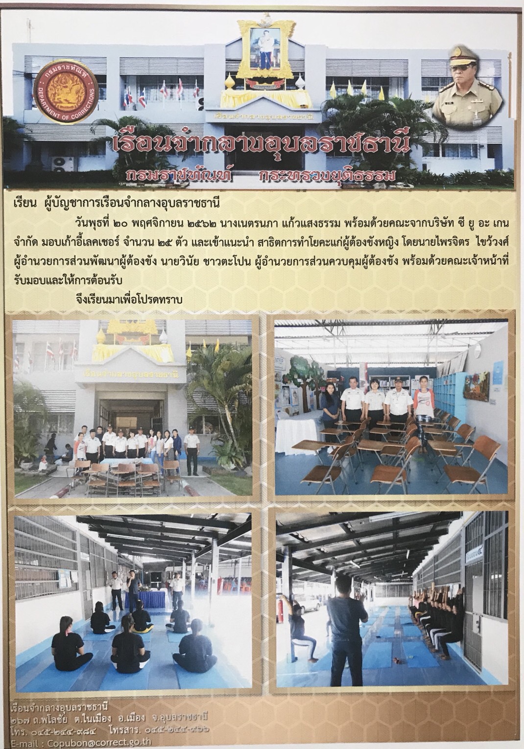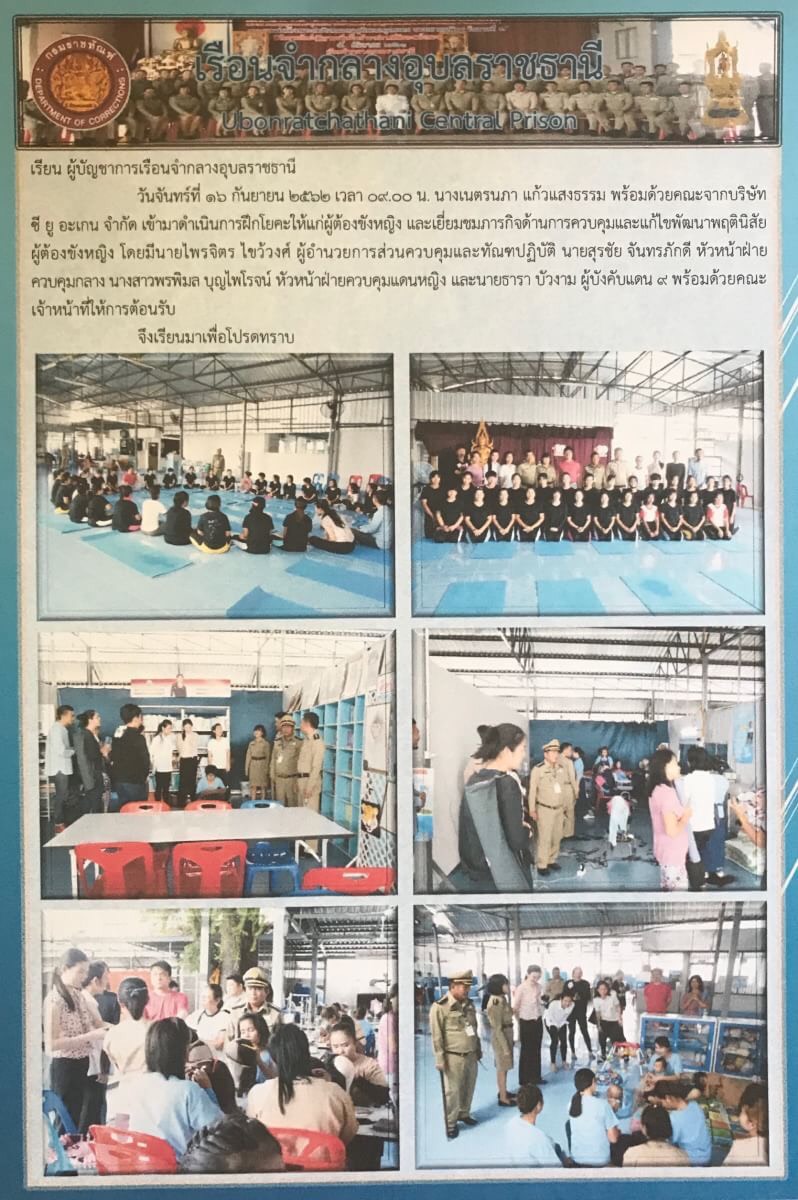 - บริษัท ซี ยู อะเกน จำกัด เข้ามอบเก้าอี้จำนวน 50 ตัว ให้แก่แผนกการศึกษาเรือนจำจังหวัดอุบลราชธานี
