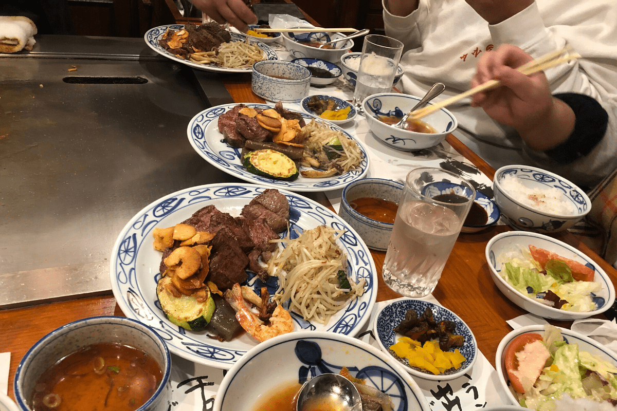 เดินออกจากสถานีเราจะพบกับร้านสเต็กเนื้อโกเบ เรียงกันเป็นแถว ว่าแต่จะกินร้านไหนดีละ ?