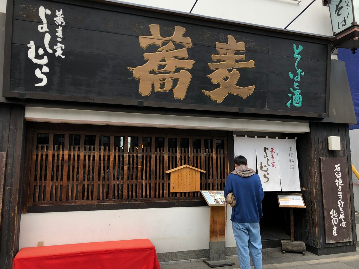 จึงทำให้เราอยากจะรู้แล้วสินะว่าเส้นโซบะแบบดั่งเดิม จะอร่อยแค่ไหน ไปลองกันเลยดีกว่า กับ ร้านโซบะ “Sobanomi Yoshimura” โซบะดั่งเดิมสไตล์เกียวโต การเดินทางมาร้านนี้ไม่ยากเลยครับเพื่อนๆ ใช้รถไฟสาย Karasuma Line มาลงที่ Gojo Station จากนั้นเดินเพียง 3 นาที ก็ถึงร้าน ร้านนี้เป็นชื่อดังของเมืองโตเกียวมากๆ มีคนต่อคิวอยู่ตลอดทั้งวัน ร้านจะเปิดให้บริการสองช่วงเวลาครับ 11:00 - 16:00 และอีกเวลา 17:00 - 21:00 ช่วงที่เราไปประมาณบ่ายโมงกว่า คนต่อแถวเข้าคิวกันอย่างเป็นระเบียบ รอคิวประมาณ 1 ชั่วโมง ก็ถึงเวลาของเรา